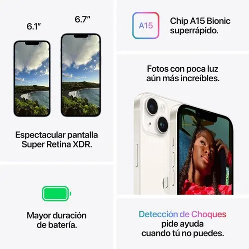 El iPhone 14 es la elección perfecta para quienes buscan un iPhone confiable, potente y con funciones que realmente importan. Excelente cámara, batería duradera y la tranquilidad de estar siempre conectado.
